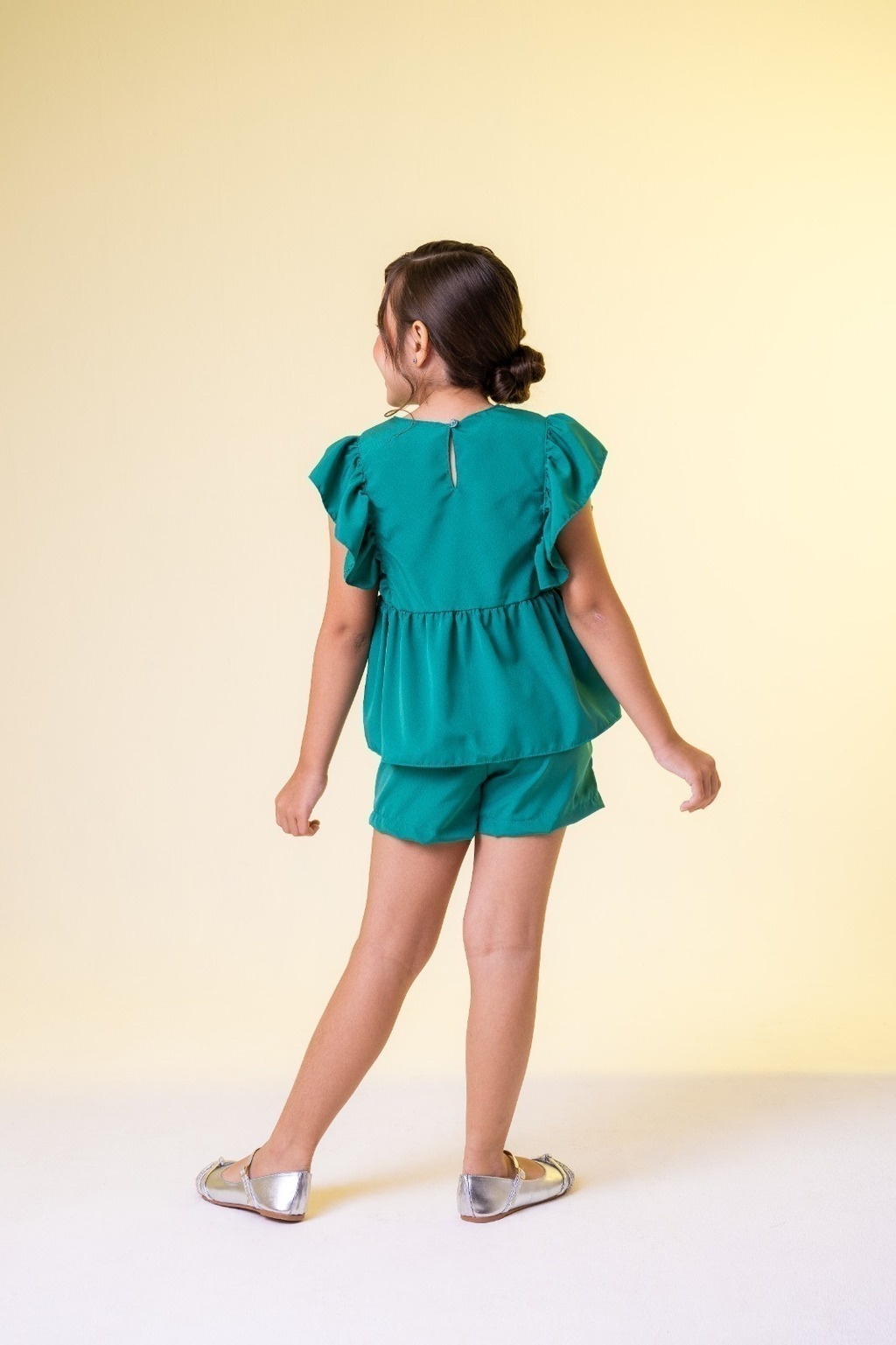 O Conjunto Aline é a escolha ideal para meninas que desejam um visual mais arrumado, perfeito para ocasiões especiais ou momentos que pedem um toque extra de elegância. A blusa possui um delicado babado na frente, que confere movimento e sofisticação ao look, realçando o charme da peça.